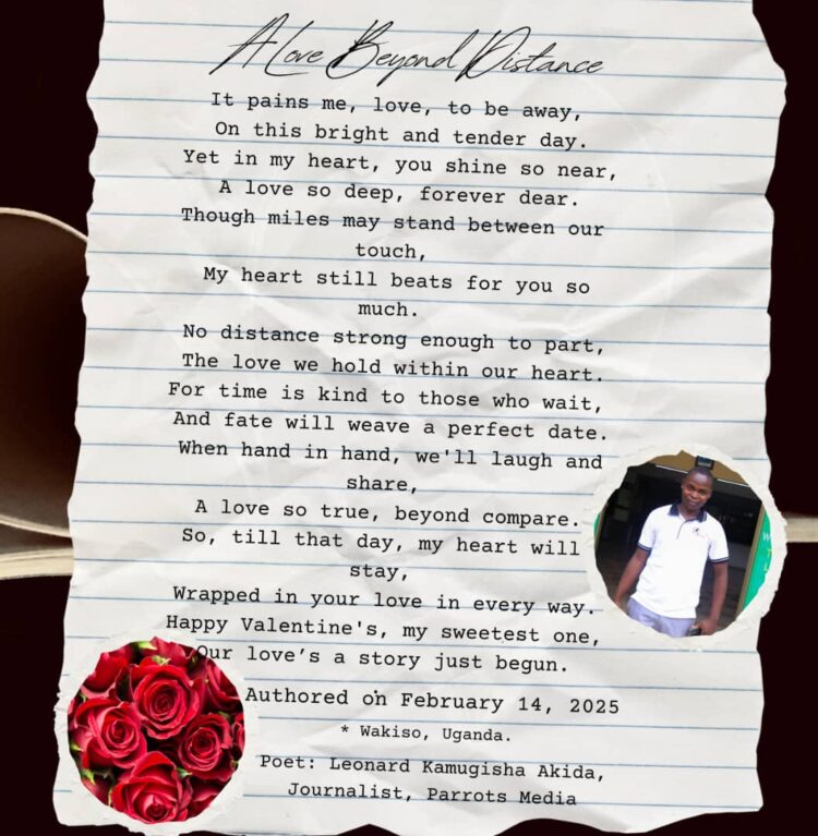 Leonard Kamugisha Akida’s poem, A Love Beyond Distance, is a heartfelt expression of longing, devotion, and unwavering love despite physical separation. Written in a simple yet deeply emotive style, the poem beautifully captures the essence of a love that transcends distance and time, reviews Parrots Media writer.