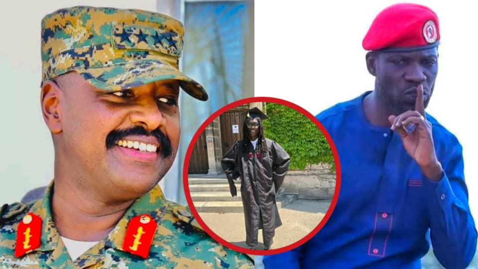 L-R: Gen. Muhoozi Kainerugaba, son of President Museveni; Anselm Besigye (circled), son of four-time presidential candidate Rtd. Col. Dr. Kizza Besigye; and Hon. Robert Kyagulanyi Ssentamu, popularly known as Bobi Wine, ghetto-raised politician and President of the National Unity Platform (NUP), a contender in Uganda’s 2026 presidential elections.