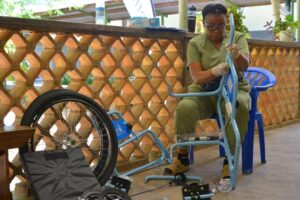 A technician from Bethany kids assembling a wheelchair at St Kizito Matany hospital
