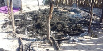 Initial police findings reveal that Akoko Dorcas had left her two children asleep in their grass-thatched house while she went out to catch white ants. Before leaving, she allegedly lit a candle, which is believed to have ignited dry grass inside the home.