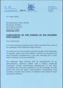 In the letter dated April 21, 2025, and addressed to His Eminence Pietro Parolin, the Vatican Secretary of State, President Museveni paid tribute to Pope Francis, describing him as an “extraordinary spiritual leader” and a “deeply respected theologian.” He praised the late Pope’s unwavering commitment to revitalizing the Catholic Church’s mission in a rapidly secularizing world.