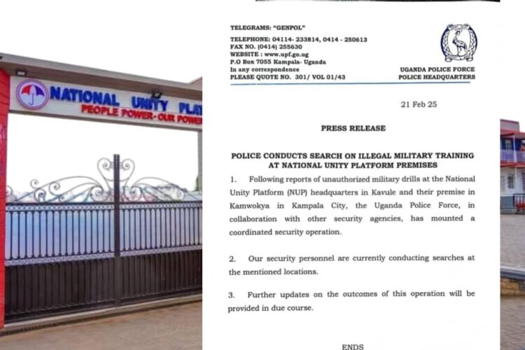 Police have announced they are conducting a security search at the opposition National Unity Platform (NUP) party headquarters, Makerere Kavule and their leadership academy in Kamwokya following reports of unauthorized military drills and other training activities.