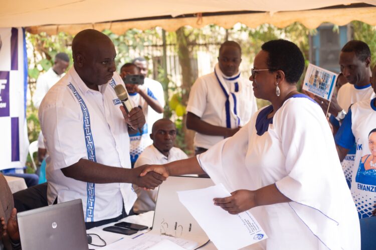 PFF EC chairperson Hon. Micheal Kabaziguruka handing in expression of interest forms to political activist Ingrid Turinawe for Rukungiri municipality MP.