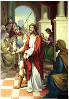 Leaving the house of Caiaphas, where he had been blasphemed, and the house of Herod, where he had been been mocked, Jesus is dragged before Pilate, his back torn with scourges, his head crowned with thorns; and he, who on the last day will judge the living and the dead, is himself condemned to a disgraceful death.