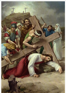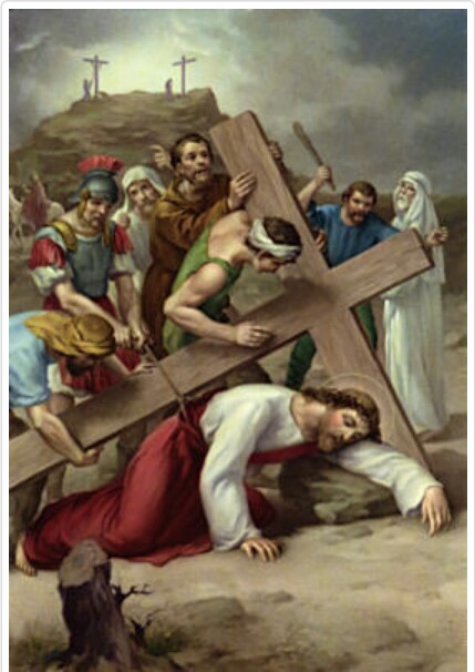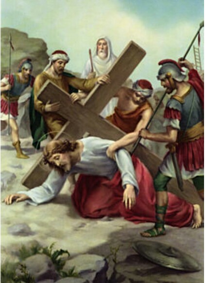 Bowed down under the weight of the cross, Jesus slowly sets forth on the way to Calvary, amidst the mockeries and insults of the crowd. His agony in the garden has exhausted his body. He is lacerated with blows and wounds; his strength fails Him. He falls to the ground under his cross.