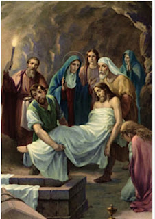 The disciples take the body of her dear beloved Son Jesus from his mother, and place it in the tomb. The tomb is closed and in it the lifeless body remains until the hour of its glorious resurrection.
