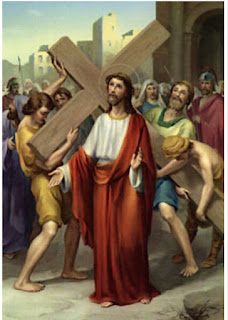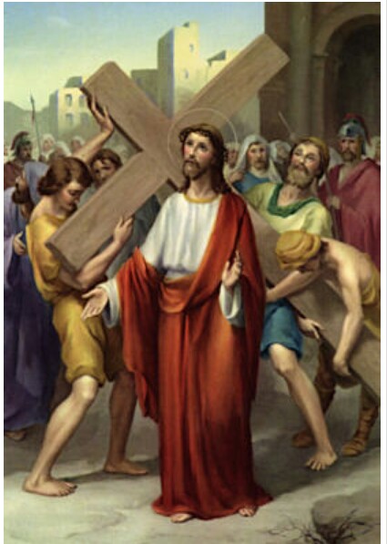 A heavy cross is laid upon the bruised shoulders of Jesus. He receives it with meekness and with a sense of commitment, for it is the instrument with which he is to redeem the world and to accomplish the mission for which his heavenly Father has sent him.