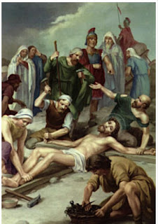 The cross is laid upon the ground and Jesus is stretched upon His bed of death. With divine dignity and forgiveness, he lets himself be nailed to the cross. The blows are struck! The blood gushes forth!