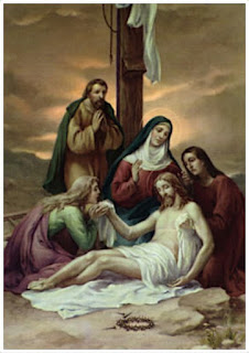 The multitudes have left the hill of Calvary. There is no one except the beloved disciple of Jesus and the holy women with Mary, the mother of Jesus. Joseph of Arimathea and Nicodemus take down the body of Jesus from the cross and place him in the arms of his afflicted mother.