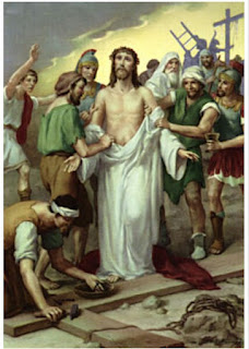 Jesus at last arrives at Golgotha and they prepare to crucify Him. They strip Him of His garments and mock Him.