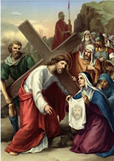 As Jesus proceeds along the way covered with the sweat of blood, a woman, moved with compassion, makes her way through the crowd, and wipes his face with a handkerchief. As a reward for her piety, the impression of His sacred countenance is miraculously imprinted upon the handkerchief.